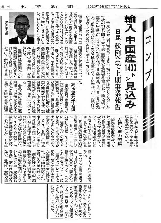 週刊水産新聞に11月6日に開催の「秋の例会」にて報告しました本年度上半期事業の実施内容について詳しく掲載されております。