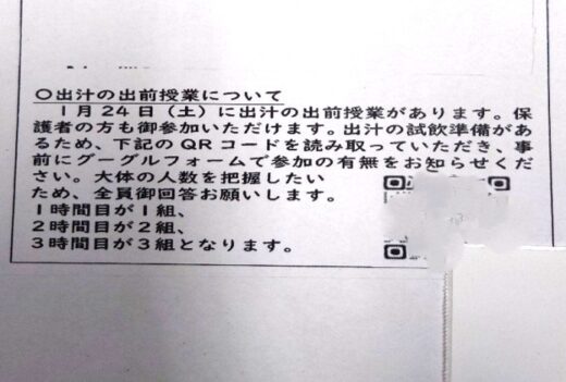準備の都合、保護者様の確認をお願いいたしましたら、担任の先生方『大三小だより1月号の学年からのお知らせ』のコーナーに『出汁の出前授業について』と題して参観者を募ってくださいました。