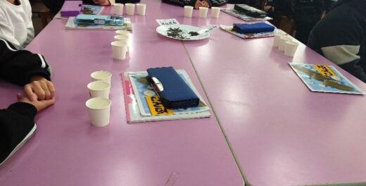 3種類の味噌汁を用意(紙コップに赤・青シールを貼ったもの、何も貼らぬ無印)お水とお味噌は、3種類とも同じものですが、少し違いがあります。