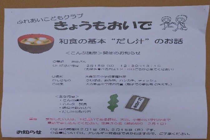 大森第三小学校をはじめ区内小学校の校長先生をなさっていらっしゃいました先生から「きょうもおもいで」(ふれあいこどもクラブ)に参加している、児童、保護者の皆様に『食育授業 こんぶ』の依頼がございました。