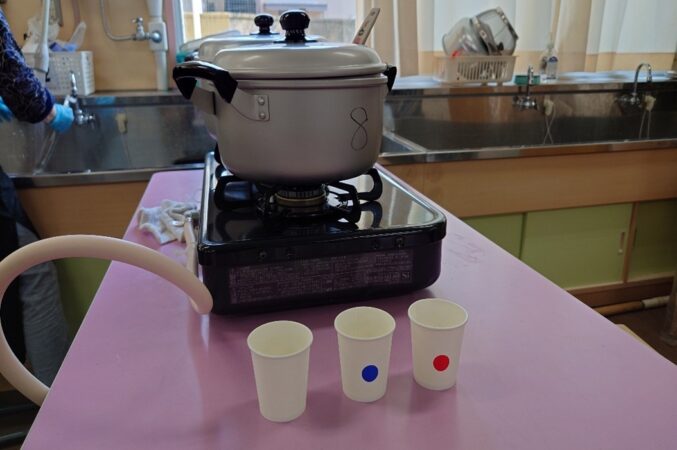 「赤シール・青シール・シールなし」の3種類の紙コップを用意して、3種類の味噌汁を試飲していただきました。