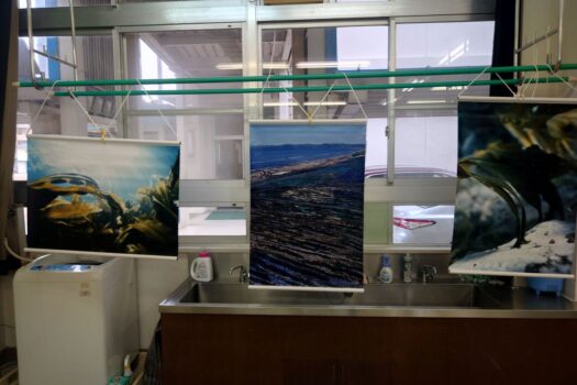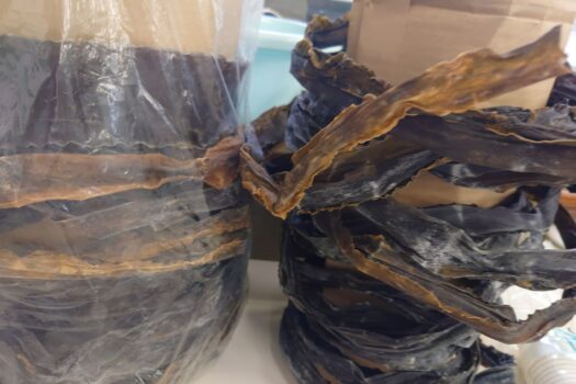 みんなで手に持って伸ばしてみます。昆布が乾燥していて折れそう、家庭科の先生にもお手伝いいただきながら慎重に広げて手でさわったり匂いをかいでみたりしました。