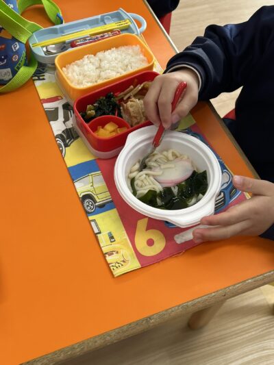 ・昆布ダシで作った年越しうどんを各クラスで試食